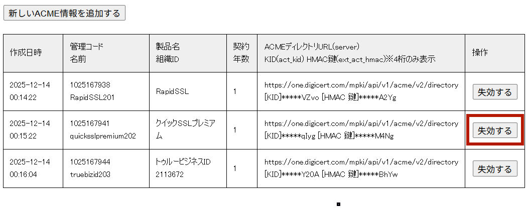 ACME情報リストから該当のACME情報の「失効する」ボタンをクリックします。