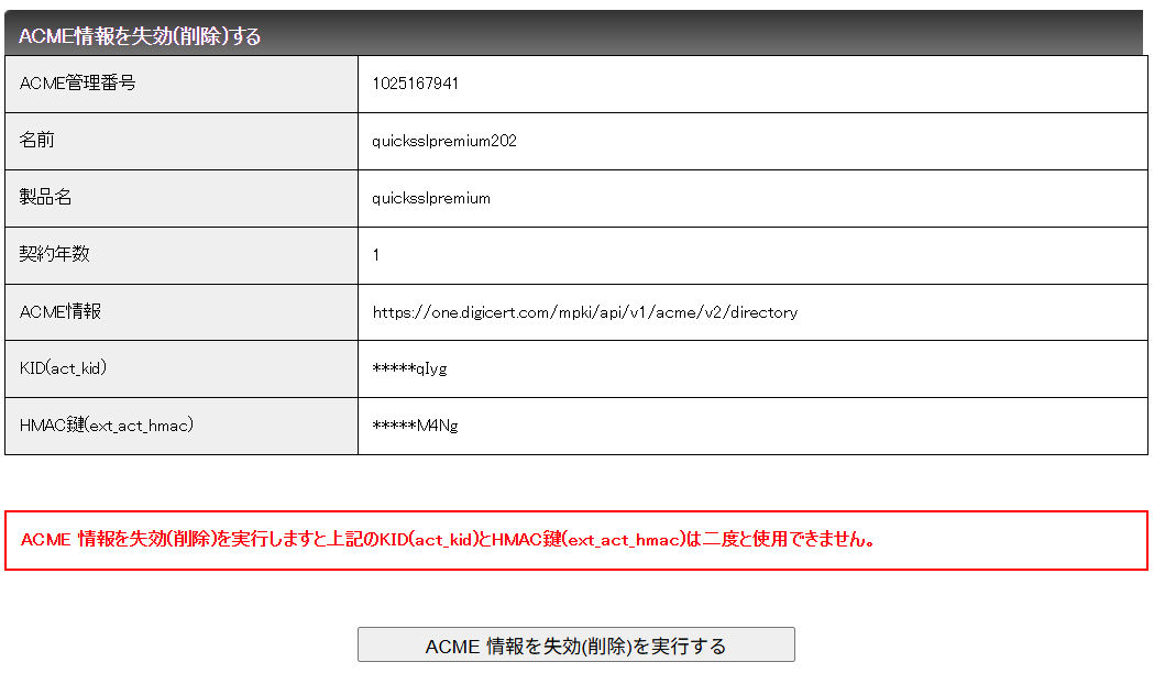 ACME情報を「失効」してもすでに発行済の証明書に影響はありませんが、今後このACME認証情報を利用して証明書の新規発行、更新発行、再発行ができなくなります。