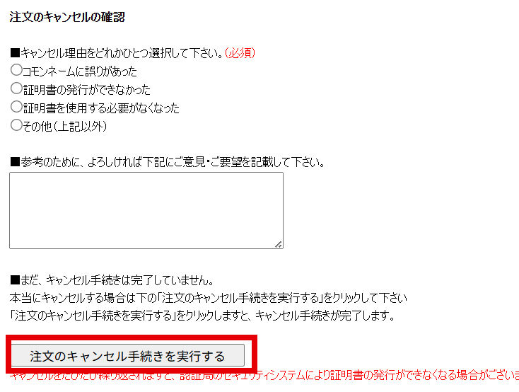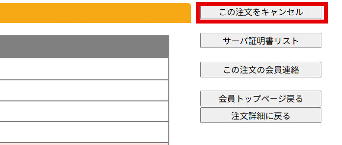 ACME情報作成後2週間を経過しますと「この注文をキャンセル」のボタンは表示されず、注文のキャンセルはできません。